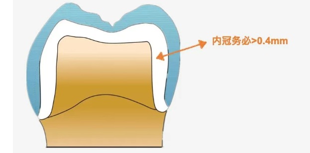 (若使用打印金屬,打印金屬放置支撐區(qū)域,內(nèi)冠厚度設(shè)計(jì)不低于0.6mm,因?yàn)榇蛴『笤搮^(qū)域需要磨除一層來保證金屬表面的致密度,避免后期飾瓷后出氣泡。)