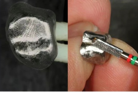 1.制作鈦金屬內(nèi)冠,對鈦冠表面打磨粗糙或雕刻花紋以增強(qiáng)金瓷結(jié)合強(qiáng)度。打磨后的鈦冠表面需處理干凈。